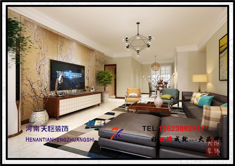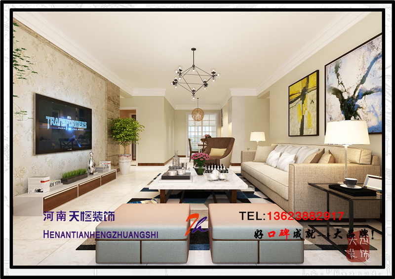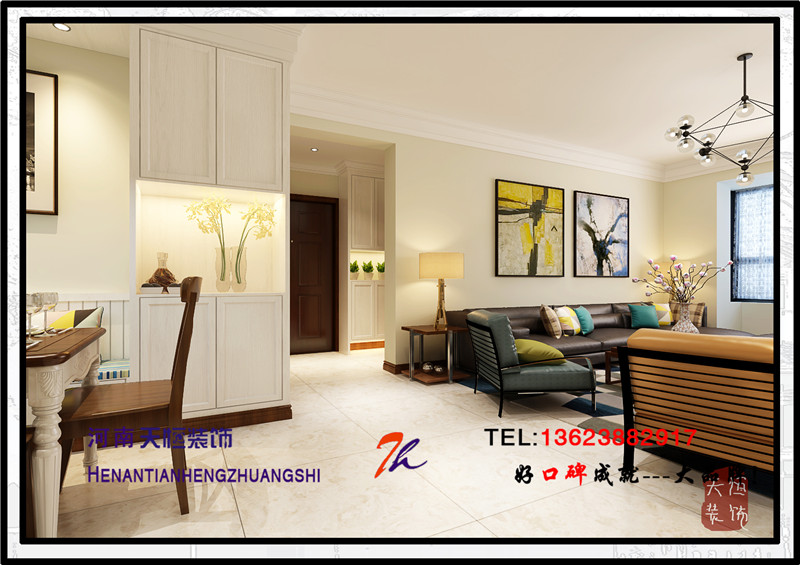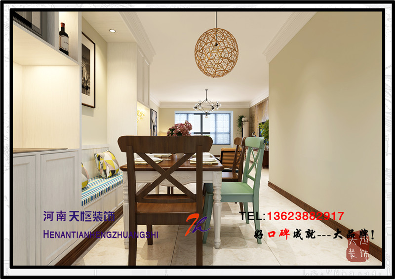 洛陽天恒裝飾工程有限公司裝修設計效果圖,小區案例為君河灣,戶型為三居室,設計師是洛陽一流的設計師董姣,設計風格為美式風格。