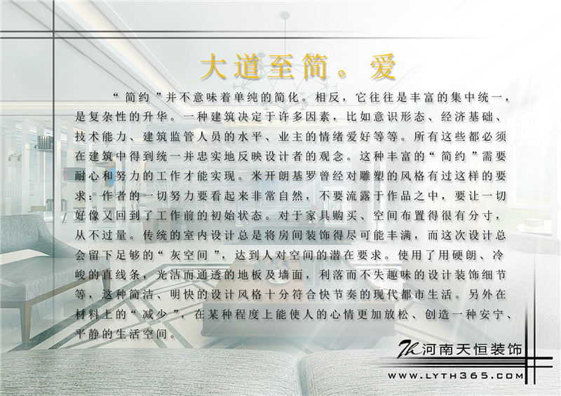 • 洛陽天恒裝飾公司是洛陽排名靠前的裝飾公司,擁有金牌設(shè)計團(tuán)隊和知名施工團(tuán)隊,中泰世紀(jì)花城小區(qū)經(jīng)典裝飾案例。